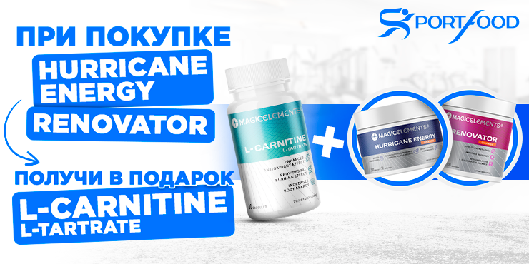 При покупке товаров Hurricane Energy (предтренировочный комплекс) или Renovator (BCAA) - получите в ПОДАРОК L-Carnitine L-Tartrate.