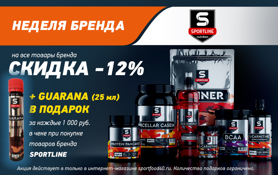 С 14 по 21 октября в рамках акции «Неделя бренда» интернет-магазине sportfood40.ru вы сможете купить любые товары российского бренда спортивного питания Sportline Nutrition со скидкой 12%. При покупке товаров бренда Sportline Nutrition дарим за каждую 1000 рублей в чеке ампулу Guarana 25 мл.